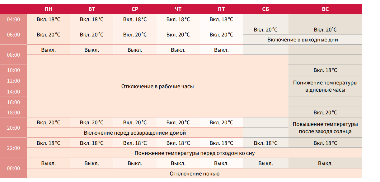 • Пульт управления снабжен недельным таймером с возможностью программировать до 6 включений и выключений кондиционера в течение каждого дня недели — с понедельника по воскресенье. Кроме того, в память пульта можно занести две индивидуальные программы работы: например, одну программу для летнего сезона, а другую — для зимнего.