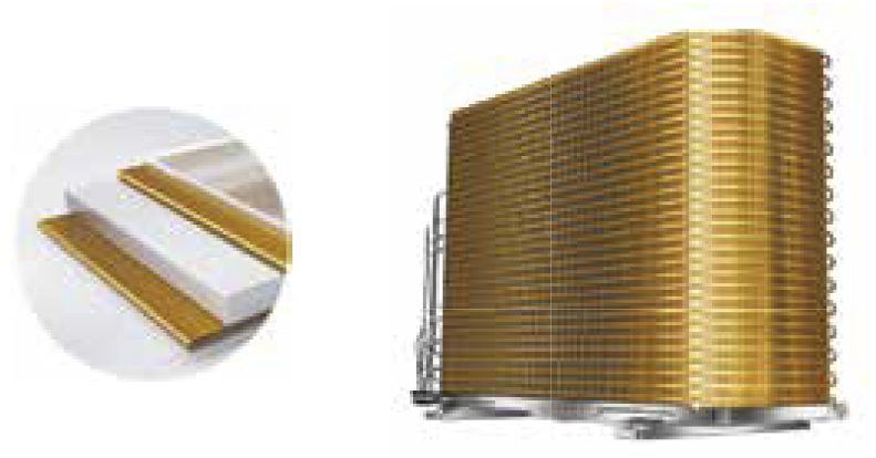 «Golden Fin». Антикоррозийное покрытие теплообменника Golden Fin из диоксида титана. Технология «Golden Fin» значительно улучшает эффективность теплообмена, а также увеличивает срок эксплуатации кондиционеров более чем в 5 раз. Кроме этого, новое покрытие теплообменника позволяет уменьшить аэродинамическое сопротивление воздуха и уровень шума кондиционера.