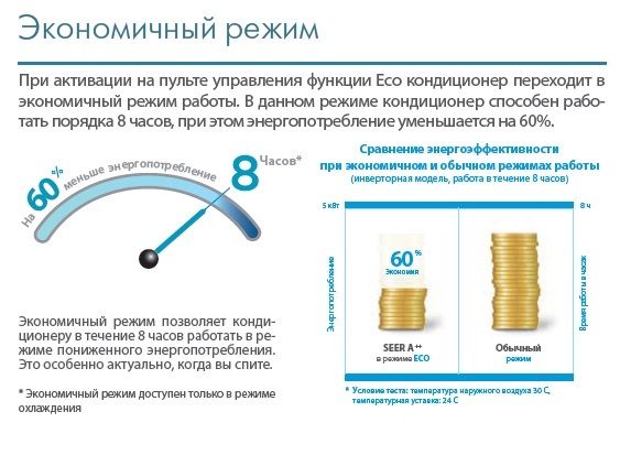 • Режим «i-ECO» — экономичный режим работы, в котором система быстро охлаждает воздух в помещении, а затем стабильно поддерживает в ней температуру 24 °С в автоматическом режиме в течение 8 часов.