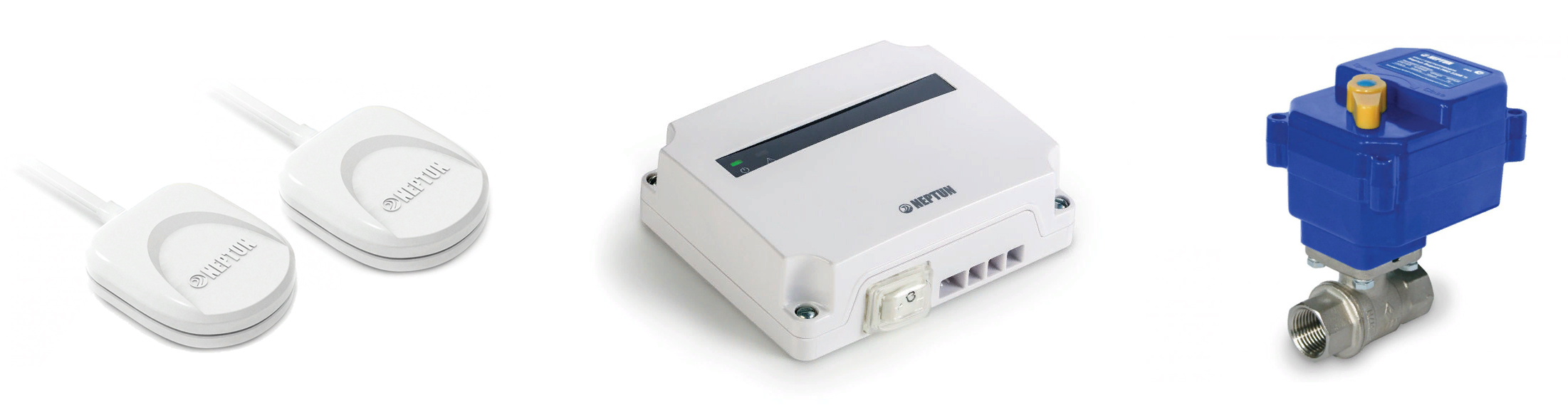 • Датчик, установленный в местах вероятного скопления воды, обнаружив протечку, подает сигнал на модуль управления системой;