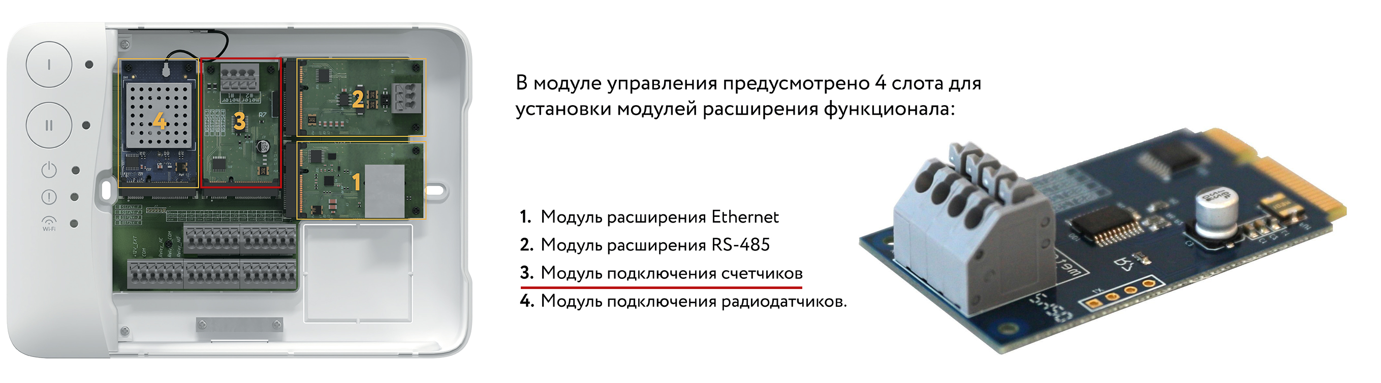• Показания хранятся в энергонезависимой памяти модуля расширения. К одному модулю расширения можно подключить до 2 счетчиков.