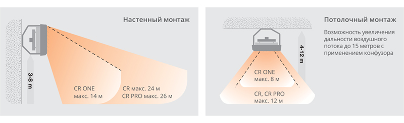 Тепловентиляторы CR устанавливаются на стенах или потолке с помощью монтажных кронштейнов под углом 90°, 60° или 30°в вертикальной плоскости. Кронштейн позволяет поворачивать агрегат в горизонтальной плоскости на угол до 78° в одну сторону, и до 50° в другую, сохраняя достаточное пространство для подключения к теплосети.