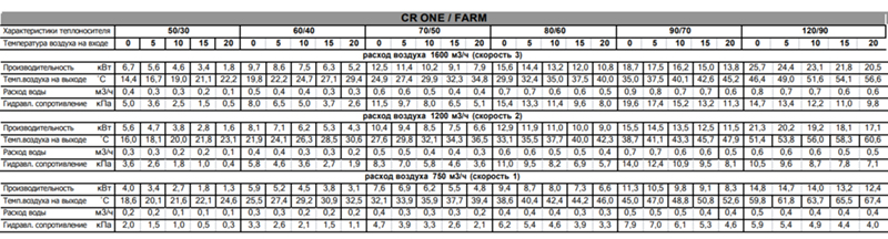 Тепловые характеристики приведены при температуре воздуха в помещении +15С и максимальном расходе воздуха.