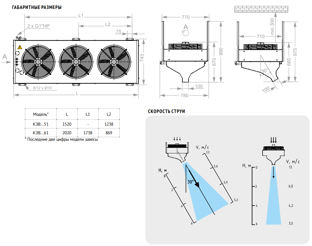 Эффективная длина струи может служить оценкой допустимой ширины или высоты проема, который защищает завеса. При вертикальной установке завес с двух сторон проема, значение, следует понимать как полуширину. Параметр указан только для "мягких" наружных условий, т.е. температура воздуха не опускается ниже 0 °С, а скорость ветра не превышает 1м/с, приточно-вытяжная вентиляция сбалансирована. Любое ужесточение условий уменьшает эффективную длину струи на 50%.