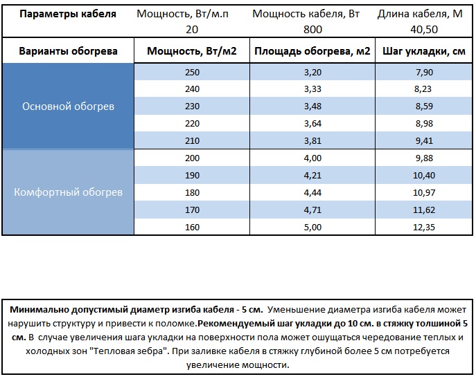 Площадь укладки при комфортном обогреве пола