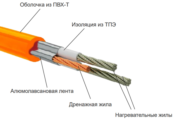 Резистивный кабель — имеет одинаковую мощность нагрева по всей длине. Регулирование мощности осуществляется с помощью термостата.