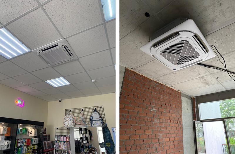 Кассетные сплит-системы предназначены для использования в больших нежилых помещениях: офисы, магазины, рестораны, конференц-залы, спортивные, учебные, медицинские учреждения и др. Отличительная особенность кассетных кондиционеров — потолочная установка внутреннего блока. Обычно он встраивается в потолочную конструкцию или монтируется в открытом виде.